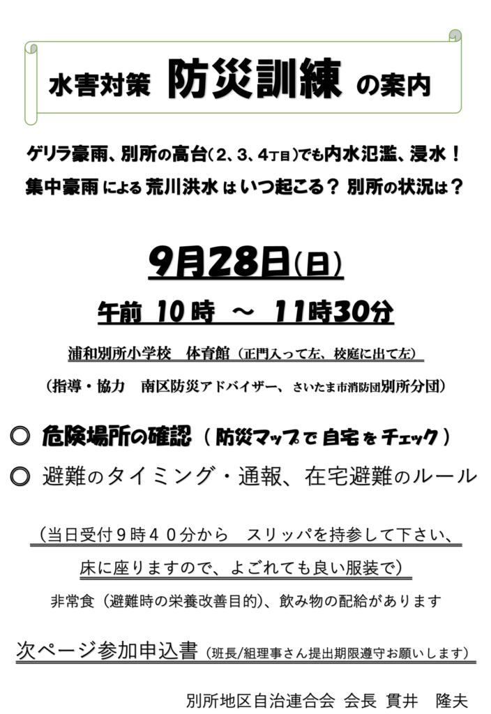 集中豪雨、ゲリラ豪雨による荒川の氾濫や別所地区の内水氾濫に備えた基本的な訓練を予定しています