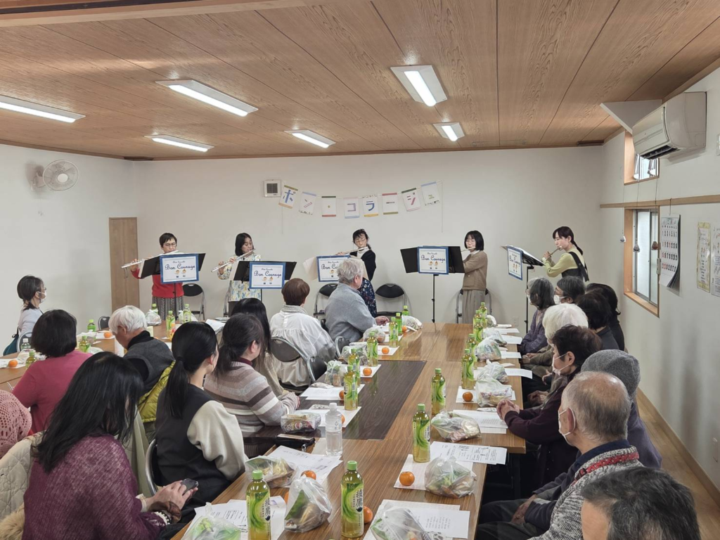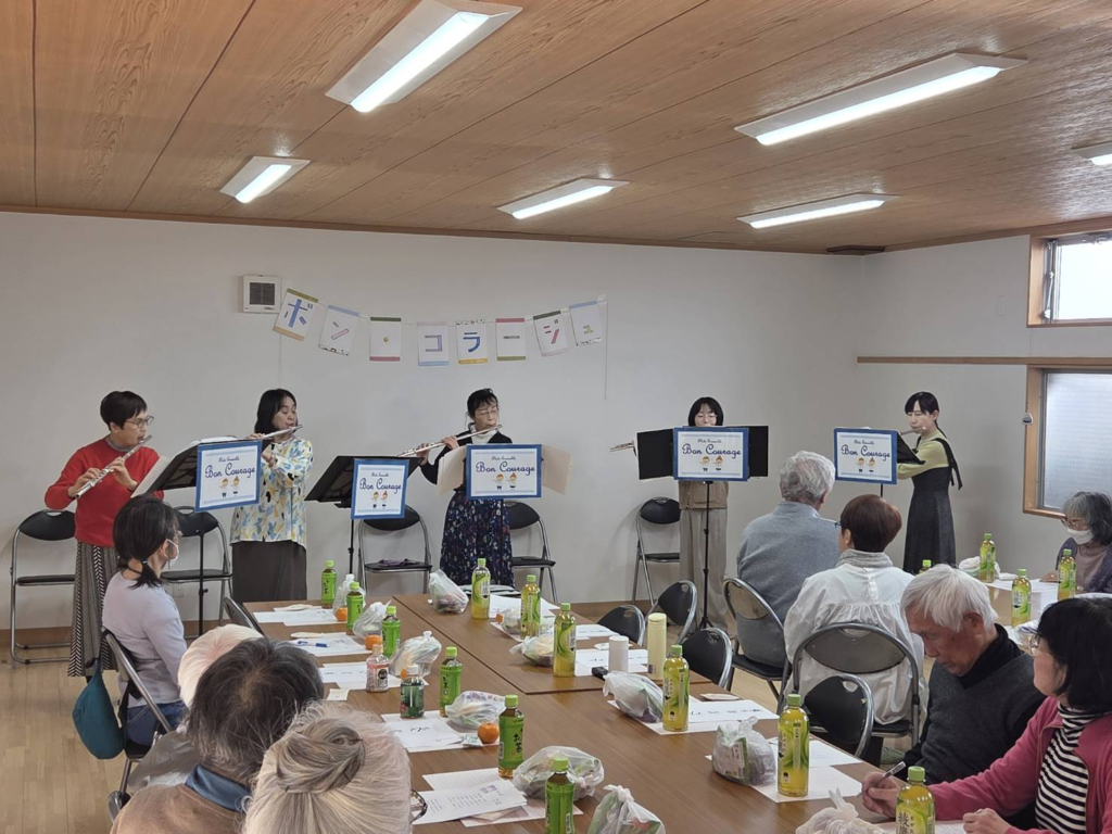 フルート演奏はボン・コラージュ(和訳・頑張って!)のメンバー5名による演奏の後に、参加した方々が歌えるような曲(瀬戸の花嫁、川の流れのように、君といつまでも、青い山脈の4曲)をフルート演奏をバックに皆さんで歌っていただき、場もすっかりなごんで盛り上がりました。