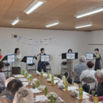 フルート演奏はボン・コラージュ(和訳・頑張って!)のメンバー5名による演奏の後に、参加した方々が歌えるような曲(瀬戸の花嫁、川の流れのように、君といつまでも、青い山脈の4曲)をフルート演奏をバックに皆さんで歌っていただき、場もすっかりなごんで盛り上がりました。
